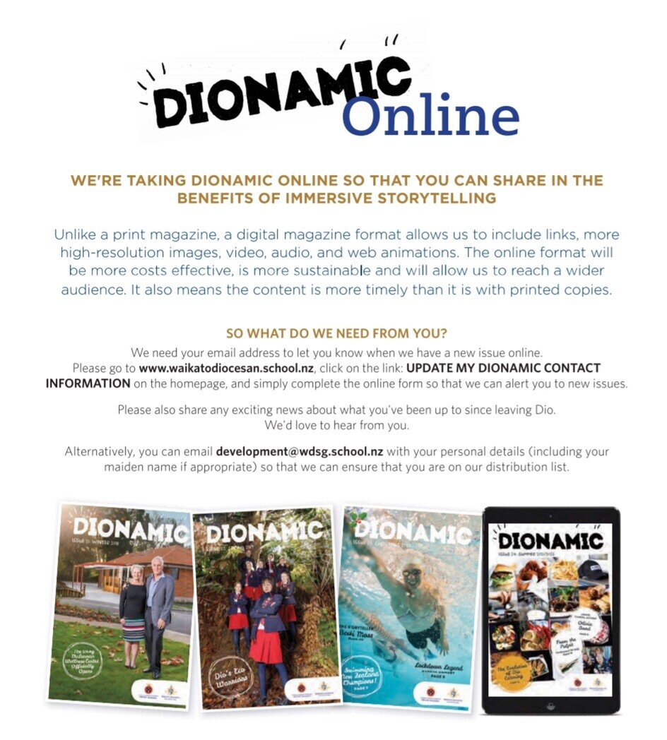 Dionamic is produced annually by the Communications and Marketing Office and is sent to Friends of Dio and to all financial members of the Old Girls' Association. If you would prefer to receive an electronic copy, please let us know at development@wdsg.school.nz